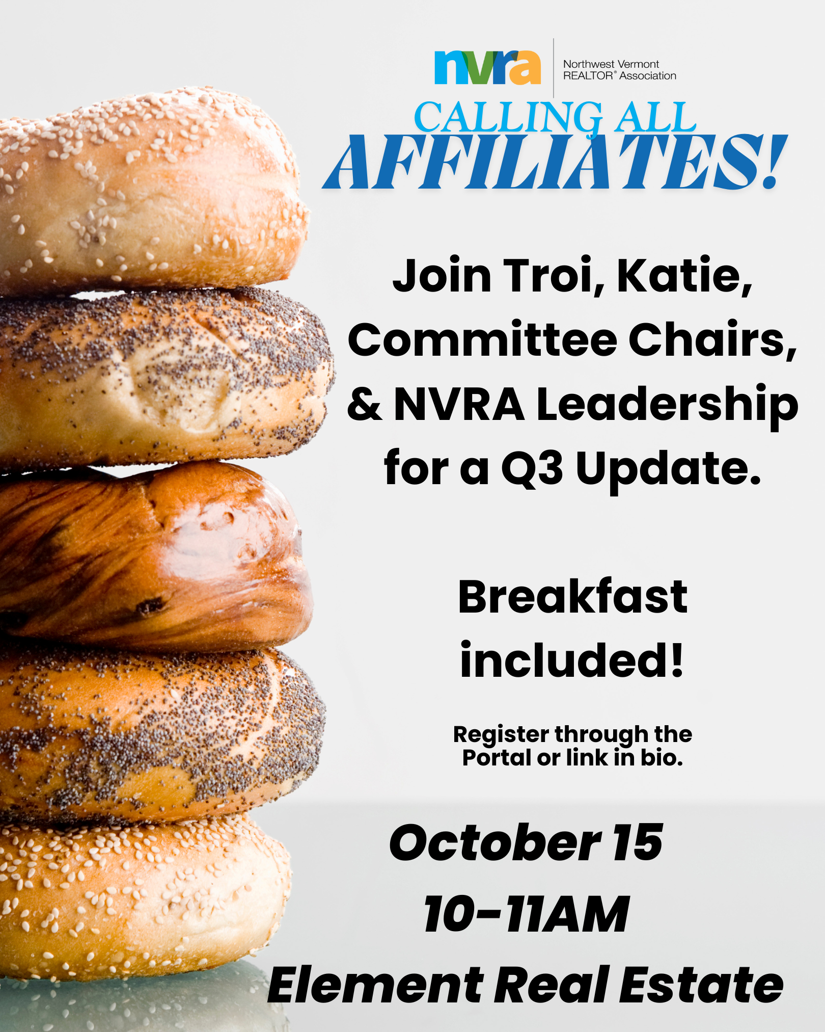 NVRA Affiliates are invited for a Q3 NVRA update with Troi, Katie, Committee Chairs, and NVRA leadership. Breakfast included!