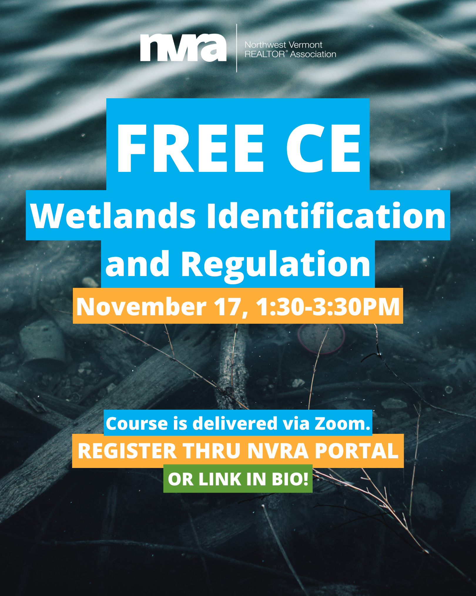 Vermont Wetlands Ecologist will describe the value of wetlands in our natural environment in terms of water quality protection, flood protection and other issues significant to property values. Participants will learn how to identify wetland characteristics, classifications, and conditions for development restrictions. Participants will understand permit requirements for site-specific conditions and will practice using the Wetland Screening Tool to map specific sites. Contact information for state specialists regarding assessment and permit applications will be provided.