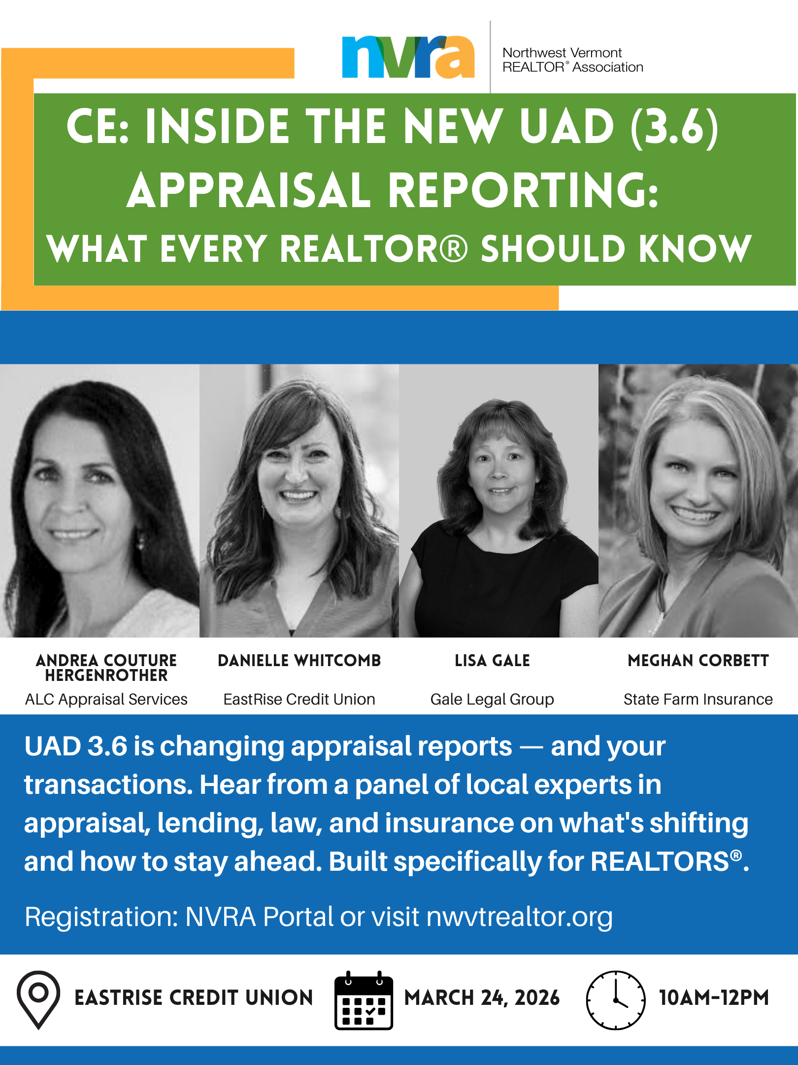 This panel discussion features Andrea Couture Hergenrother (ALC Appraisal Services), Danielle Whitcomb (EastRise Credit Union), Lisa Gale (Gale Legal Group), and Meghan Corbett (Statefarm Insurance), each offering their professional perspective on how UAD 3.6 report format changes affect valuation, lending decisions, legal considerations, and insurance coverage. REALTORS® will gain practical insights to better anticipate appraisal-related issues, communicate with clients, and navigate transactions with confidence.