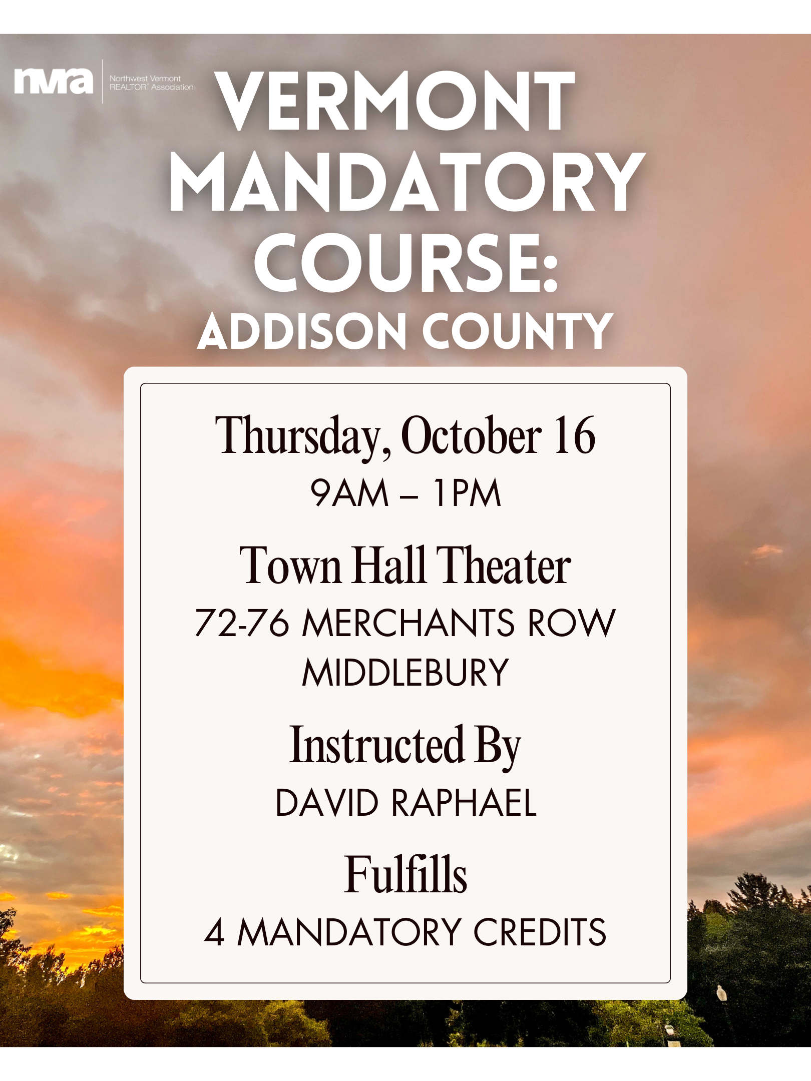 All licensed real estate agents are required to take the Vermont Mandatory Course ahead as part of license renewal requirements. This 4-hour course includes recent disciplinary actions, legislation, and court cases, as well as hot topics relating to VT practice issues, and federal regulation of the real estate industry.   Instructor: David Raphael Registration includes course and very light snacks.  Location: Town Hall Theater, 72-76 Merchants Row, Middlebury, VT 05753